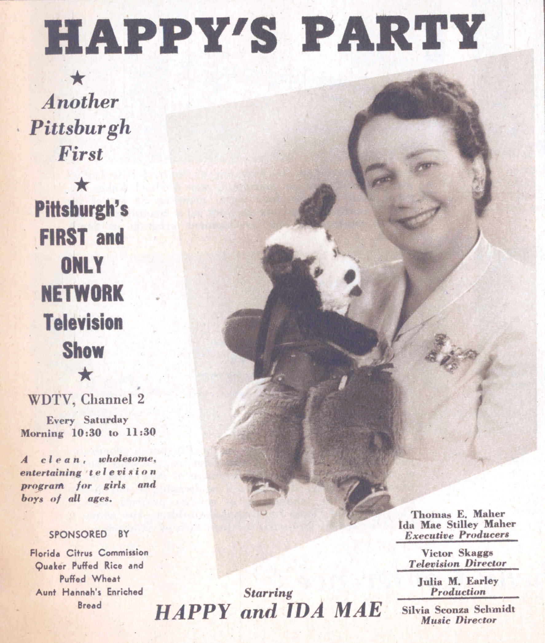 Happy’s Party (with human host Ida Mae) was a popular children’s program which was produced at WDTV for the DuMont Network.